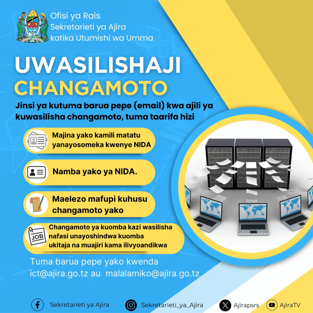 Once your message is ready, send it to any of the official Ajira Portal support emails below: ict@ajira.go.tz, malalamiko@ajira.go.tz, Email Subject Example: “Challenge Submitting Application – [Your Full Name & NIDA Number]”