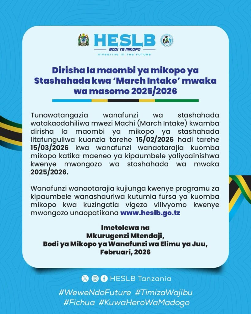 If you are a Diploma student joining through the March Intake 2025/2026, this is your chance to apply for financial support through HESLB. Make sure your programme is among the priority areas and follow all guidelines provided in the official Diploma loan application guide. To avoid missing out, submit your application between: 15/02/2026 – 15/03/2026, For more details, visit: www.heslb.go.tz