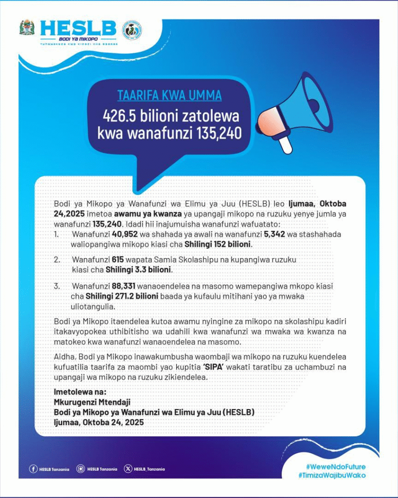 The official statement released by HESLB on Friday, October 24, 2025, confirms that this is the first batch of allocations. It covers both newly admitted and continuing students who met the qualification criteria after verification of academic and admission records. HESLB further stated that subsequent disbursement rounds will continue as the Board receives confirmation from universities and colleges regarding student admissions and examination results.