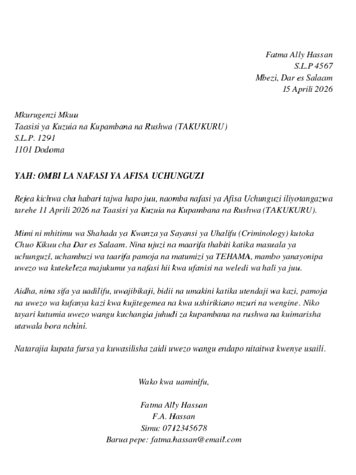 For applicants applying for PCCB (TAKUKURU) Jobs 2026, the quality of the application letter is a key factor that can influence the early stages of recruitment. A well-prepared letter that follows the correct structure and presents information clearly increases your chances of being shortlisted. Applicants are strongly advised to prepare their letters carefully and ensure they meet public service standards.