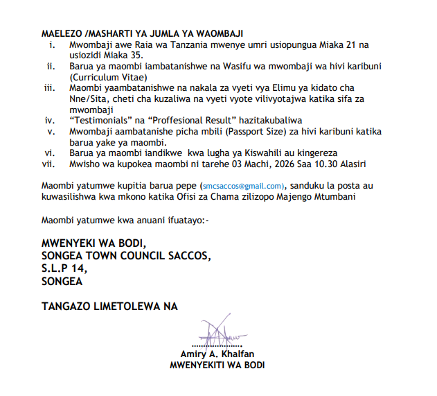 Songea Town Council SACCOS LTD was registered in January 1988 under Certificate No. RVR 153, in accordance with the Cooperative Societies Act. The main objective of the Society is to uplift, strengthen, and develop the economic and social welfare of employees of Songea Municipal Council, in compliance with Cooperative laws, regulations, and procedures. In order to continue providing quality services to its members, Songea Town Council SACCOS LTD invites applications from qualified candidates for the following vacant positions: