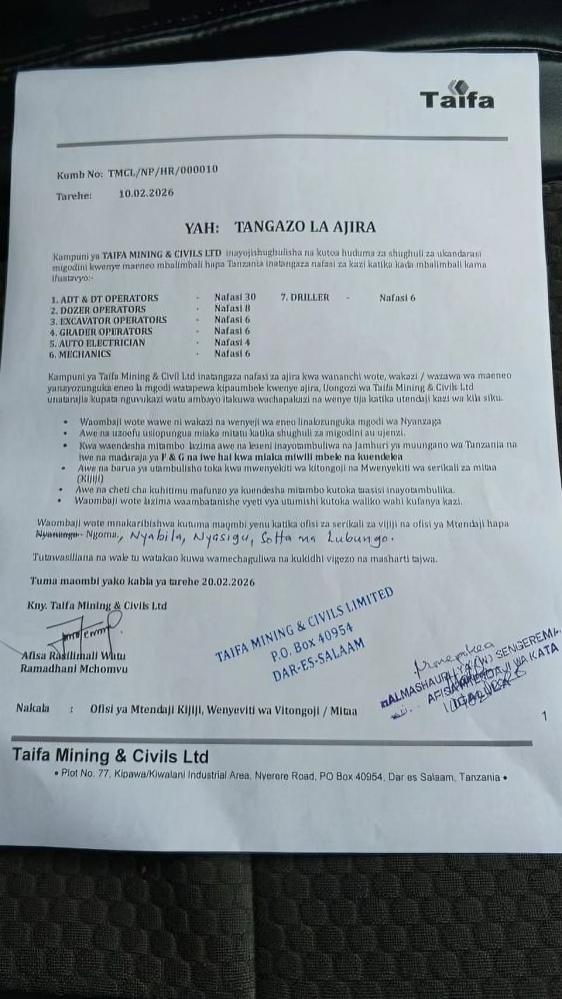 Only shortlisted candidates will be contacted, Application Deadline: The deadline for submitting applications is: 20th February 2026, Employer Details Taifa Mining & Civils Ltd, P.O. Box 40954, Dar es Salaam, Tanzania