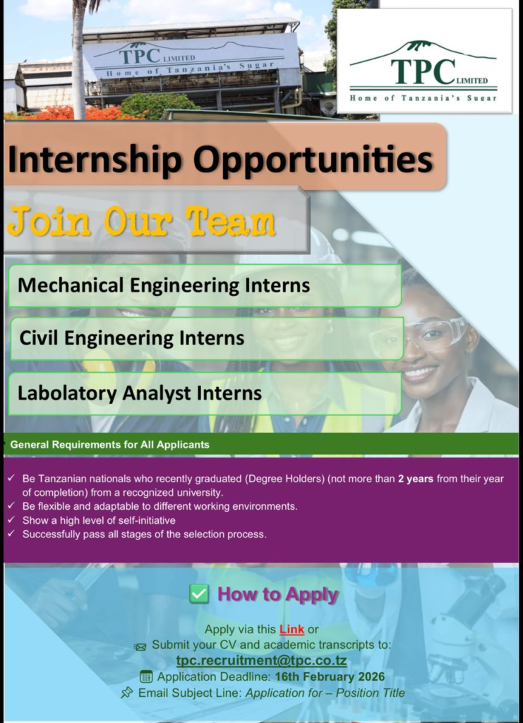 TPC Limited, widely known as the Home of Tanzania’s Sugar, has announced exciting internship opportunities for qualified Tanzanian graduates. This internship program is designed to attract young, energetic, and career-driven graduates who are ready to gain real industrial experience in one of Tanzania’s leading companies, TPC Limited Internship Opportunities 2026.